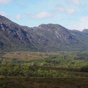 Geosite Description: The western slopes Tyndall Range form a steep and foreboding backdrop when driving on the Anthony Road near Tyndall Creek. The high cliffs and slopes have been scoured by glacial activity and are composed of resistant conglomerate and sandstone (Owen Conglomerate). Whitham Falls may be seen a few kilometres to the south and is spectacular after heavy rain. To the east of the skyline, the landscape changes dramatically and the Tyndall Range forms a high dissected plateau with a labyrinth of glacial tarns and mountain peaks. The only native deciduous tree in Tasmania, the Deciduous Beech or Nothofagus gunni, is common in this alpine environment making autumn a special time of the year to visit the Tyndall Range.